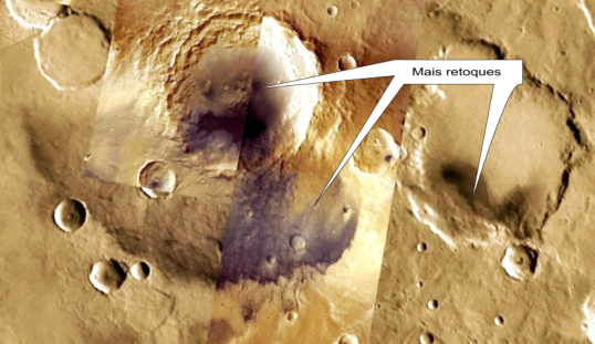 Aqui o retoque com o airbrush do photoshop, fica muito claro. Além disso, pedaços de mapa que não combinam. Você acha que estamos rodeados de extraterrestres, na Lua , Marte ou aqui mesmo? Quem sabe? Parece que só a Nasa sabe. Se não, porque perderiam tempo retocando as fotos?